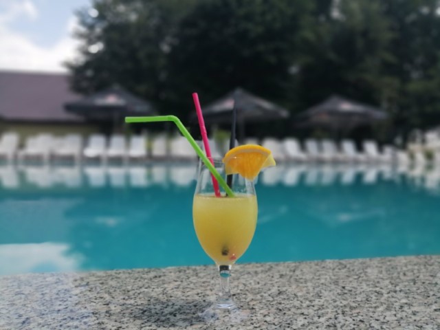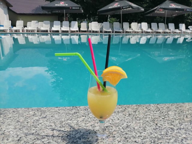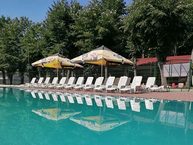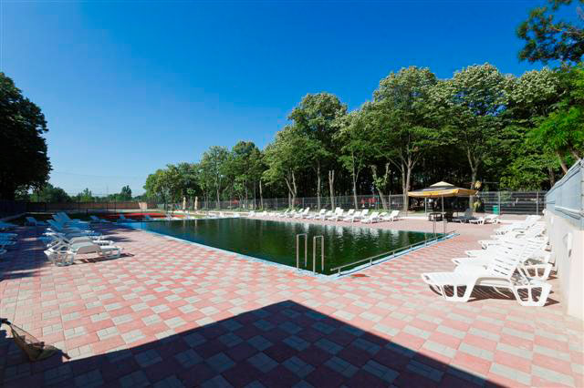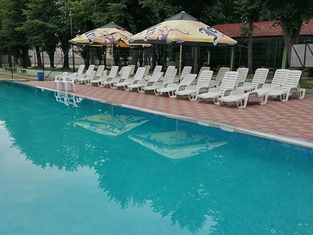 U nizu sportskih terena, nalazi se bazen na otvorenom, površine 22x11m i manji dečiji bazen. Za potpuno uživanje prilagođen je i plivačima i neplivačima s obzirom da se dubina bazena postepeno povećava od 1,5m do 2,5m dubine. Za sve goste obezbeđene su udobne ležaljke i suncobrani, svlačionice, toaleti, i tuševi. Letnja bašta i bar nude osveženje u hladu lipove šume.